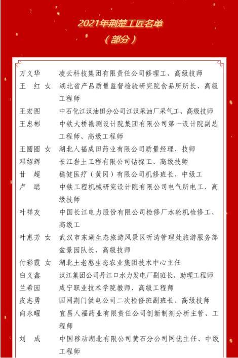 “荆楚工匠”是湖北省总工会统一命名的工匠型优秀职工,已经成为湖北高技能人才的一张闪亮名片。好体育app全站官方登录入口集团通过选树“劳动竞赛标兵”“劳动模范”,开展劳动技能竞赛,创建劳模创新工作室等活动,激励和培养了一大批爱岗敬业,勇于创新的工匠人才,弘扬了劳模工匠精神,为推动集团创新高质量发展做出了卓越贡献。